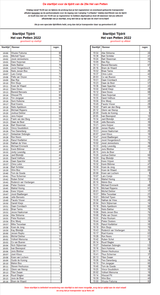 2022 Hel van PettenDe startlijst staat online!! 13 mei 202213 mei 2022 De Hel Van Petten Deel dit bericht: Klik om te delen op Facebook (Opent in een nieuw venster) Facebook Klik om te delen op X (Opent in een nieuw venster) X Klik om te delen op WhatsApp (Opent in een nieuw venster) WhatsApp Klik om dit te e-mailen naar een vriend (Opent in een nieuw venster) E-mail